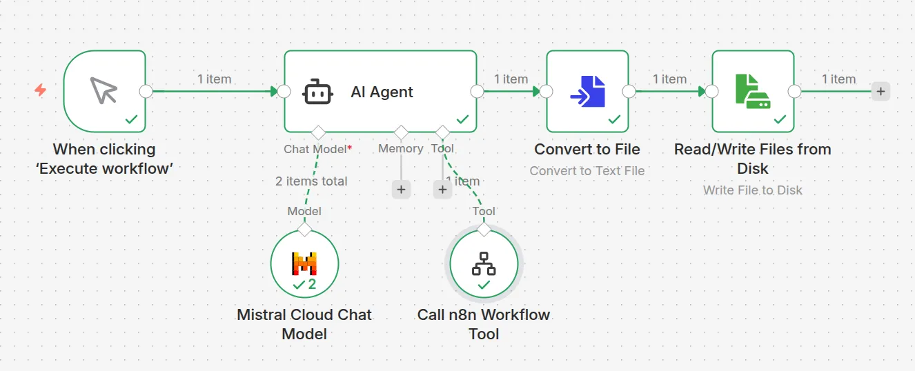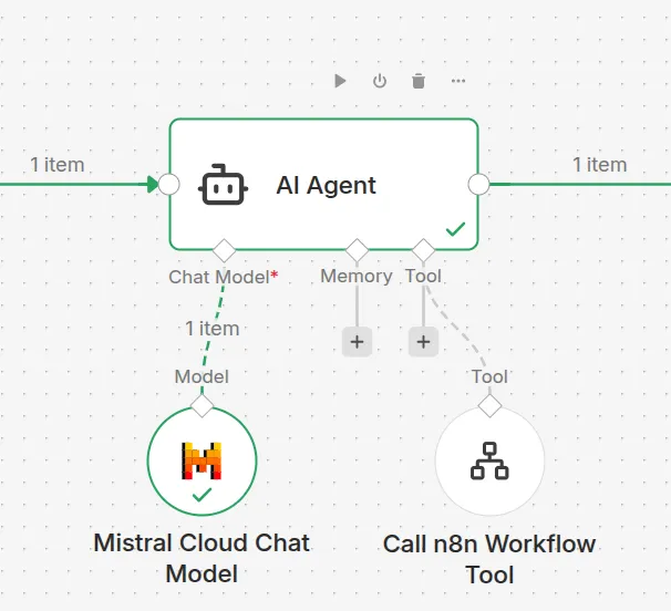 J’ai créé ici un agent qui utilise l’API Mistral. On ne peut pas directement fournir un nœud n8n comme outil à un agent : j’ai donc dû créer un “subworkflow” dont le seul rôle est d’appeler un nœud de lecture de fichier.