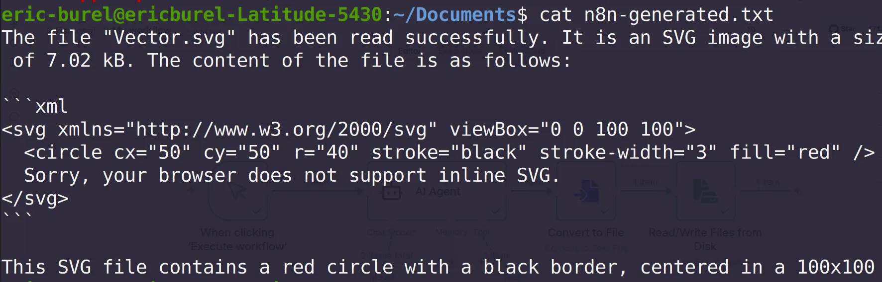 Après quelques minutes de configuration, j’ai pu mettre en place un agent capable de lire un fichier dans mon dossier “Documents” et de créer en réponse une description de ce fichier au format texte !
